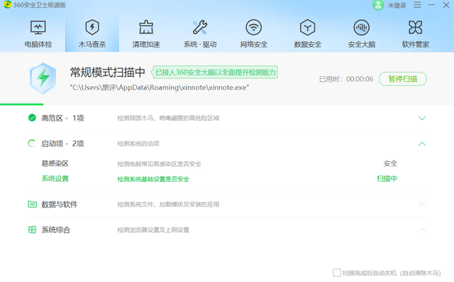 除此之外,還保留了木馬查殺功能,跟體檢功能一樣,都是接入了360安全大腦,所謂的360安全大腦,其實(shí)就是依托大數(shù)據(jù)、人工智能、云計(jì)算、IoT智能感知、區(qū)塊鏈等新技術(shù),從而讓360安全衛(wèi)士極速版更加的聰明,可以智能識(shí)別多種攻擊場(chǎng)景,而且顯著提升了病毒查殺、系統(tǒng)修復(fù)、優(yōu)化加速和電腦清理等功能的檢測(cè)和處理能力,所以即使這是一個(gè)極速版本,但是安全性能反而是沒有因此而下降的。