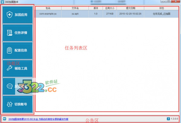 該軟件主界面支持任意拖拽,主要分三大區(qū)域。左側(cè)一欄六個(gè)按鈕為功能區(qū),顯示核心功能。右側(cè)為任務(wù)列表區(qū),顯示加固任務(wù),選中一項(xiàng)任務(wù),右鍵菜單項(xiàng)可執(zhí)行相關(guān)操作。主界面下方為公告區(qū),主要展示公告、幫助信息等,如kkx小編分享的圖片: