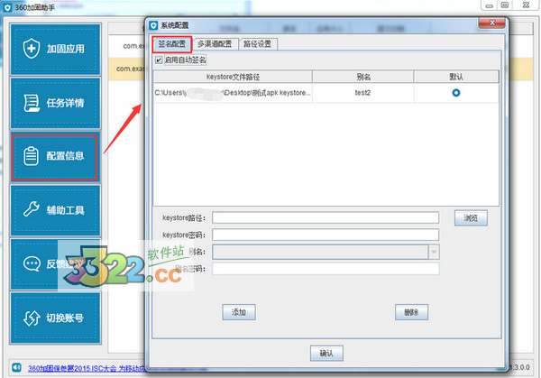 (1)主界面點(diǎn)擊“配置信息”,簽名配置完成后選擇“多渠道配置”,如kkx小編分享的圖片: