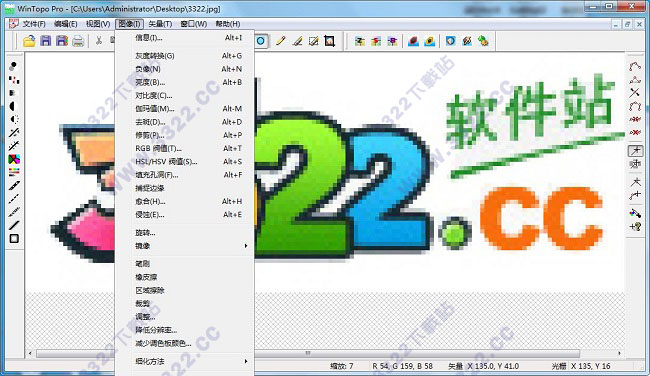 4、點擊“圖像”,可對圖像進行多種處理,如灰度轉(zhuǎn)換、負像、亮度、對比度、祛斑、修剪等調(diào)整,或可打開筆刷、橡皮擦等工具,或可進行邊緣捕捉、填充孔洞及其他細化處理