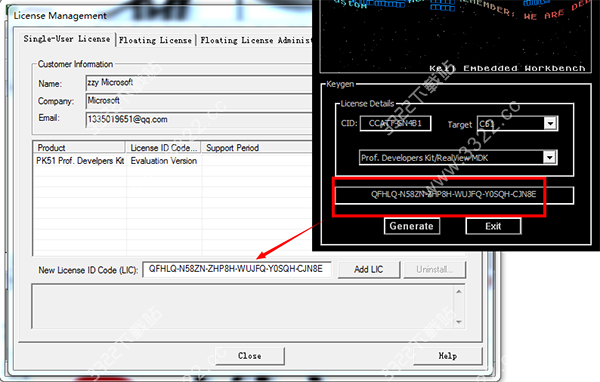 2.我們回到剛才下載的數(shù)據(jù)包中將注冊機(jī)“KEIL_Lic.exe”運(yùn)行,將CID中的機(jī)器碼復(fù)制到注冊機(jī)中的“CID”處,點(diǎn)擊Generate,生成注冊碼,如kkx分享的安裝截圖: