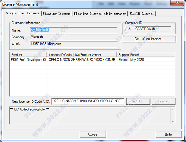 3.再將注冊機(jī)生成的注冊碼復(fù)制到激活窗口中,點(diǎn)擊AddLIC,如kkx分享的安裝截圖: