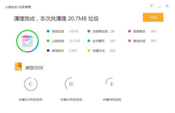 7、第七步,清理完成,本次共清理的垃圾有多少M(fèi)B,同時(shí)也告訴你各個(gè)分區(qū)恢復(fù)了多少M(fèi)B的空間。這點(diǎn)非常人性化,如下圖kkx分享的圖片所示:
