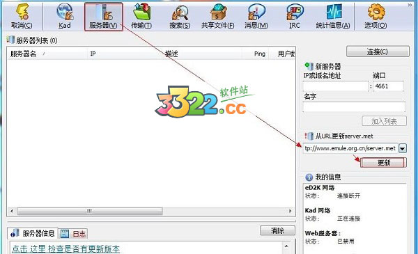 1、打開(kāi)電驢,點(diǎn)“服務(wù)器”復(fù)制網(wǎng)址到右面的“從URL更新server.met”輸入框中,再點(diǎn)“更新”