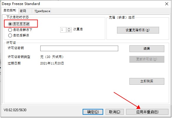 1、首先打開冰點還原的界面,在“下次啟動時狀態(tài)”欄下選擇“啟動后解凍”,選擇“應用并重啟”。