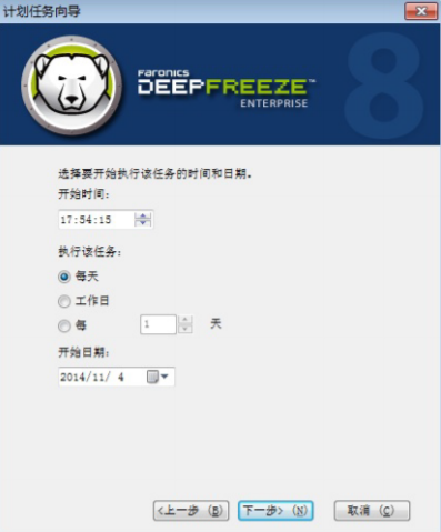 根據(jù)上一步設置的執(zhí)行頻率,下一步會出現(xiàn)特定類型的時間設置,下圖是頻率為每天的時間設置。