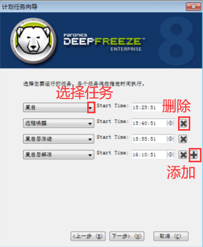 在這個窗口中,您可以選擇需要冰點還原執(zhí)行的任務,包括重啟、關機、遠程喚醒等多種任務均可選擇??呻p擊任務直接進入下一步,也可以單擊任務后點擊“下一步”繼續(xù)。