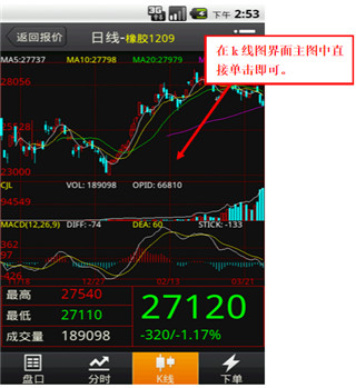 在k線圖界面點(diǎn)擊標(biāo)題欄右側(cè)的菜單按鈕。如下圖