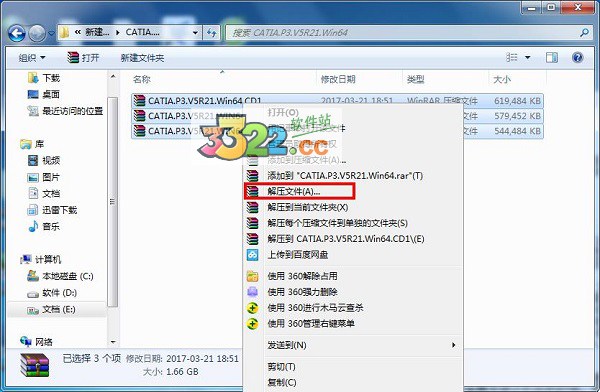 二、全選Catiav5r21中的全部三個(gè)文件,記住需全部選中一次性解壓,如kkx分享的圖片: