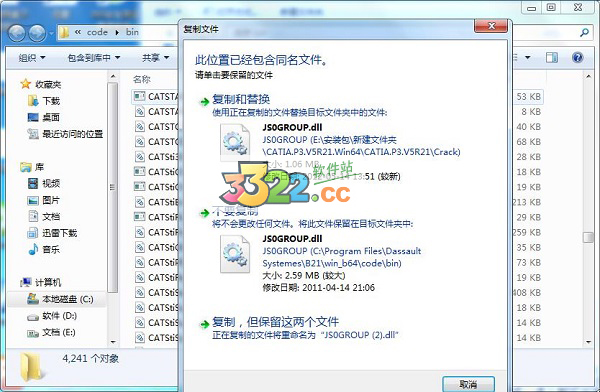 1、復(fù)制crack文件夾中的JS0GROUP.dll文件,粘貼到Catiav5r21安裝路徑C:\ProgramFiles\DassaultSystemes\B21\intel_a\code\bin文件夾下(64位catia請(qǐng)粘貼到C:\ProgramFiles\DassaultSystemes\B21\win_b64\code\bin文件夾下),并覆蓋原文件,如kkx分享的圖片: