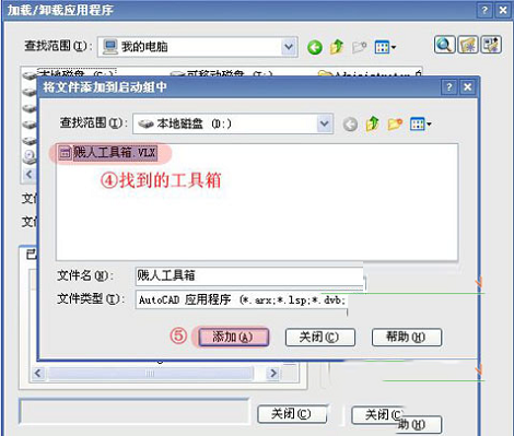 2、點(diǎn)擊對話框上啟動(dòng)組里的“內(nèi)容...”--》點(diǎn)“瀏覽”,找到工具箱,點(diǎn)“添加”,把賤人工具箱添加進(jìn)去,關(guān)閉對話框。