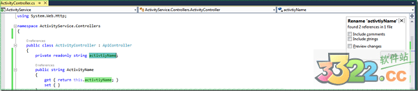當(dāng)需要重命名一個(gè)變量時(shí),可以右鍵單擊變量名稱選擇重命名或是按F2快捷鍵,Visual Studio 用綠色字高亮標(biāo)識(shí)出當(dāng)前文件中用到此變量的地方,同時(shí)在當(dāng)前編輯器的右上角顯示引用到此變量的其它文件,可以預(yù)覽重命名后的變化