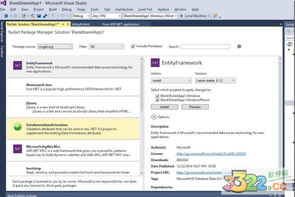 Visual Studio 2015提供圖形化的NuGet包操作工具,支持包搜索,選擇項(xiàng)目需要引用的包是可以選擇版本