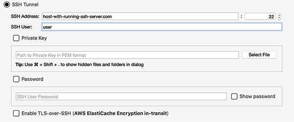 單擊“SSH連接設(shè)置”中的“啟用跨SSH的TLS”,并按照一節(jié)中的說明進(jìn)行操作如何通過EC2連接到彈性緩存