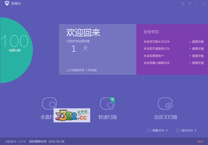 3.查看是否有第三方的防病毒產(chǎn)品,如果有,嘗試關(guān)掉之后重新安裝安騎士Agent,部分第三方的防病毒軟件可能會(huì)禁止安騎士Agent訪問(wèn)網(wǎng)絡(luò)。打開(kāi)軟件安騎士軟件,然后我們點(diǎn)擊全盤(pán)掃描,然后等待掃描結(jié)果