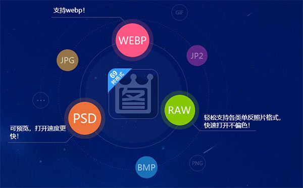 除了支持JPG/BMP/PNG常見圖片格式和GIF/TIF動畫格式,還支持PSD/RAW/WEBP/JP2等專業(yè)格式。