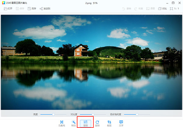 1)在圖片處理窗口點擊工具欄上“增強”按鈕,即可以用鼠標(biāo)移動滑塊調(diào)節(jié)圖片亮度、對比度、色彩飽和度了。