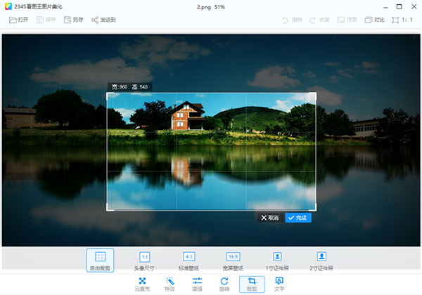 在圖片處理窗口,在工具欄點擊“裁剪”按鈕,就可以看到自由裁剪、正方形、標(biāo)準(zhǔn)屏幕(4:3)、屏幕壁紙(16:9)、1寸證件照、2寸證件照。證件照還會實時提示證件照打印質(zhì)量
