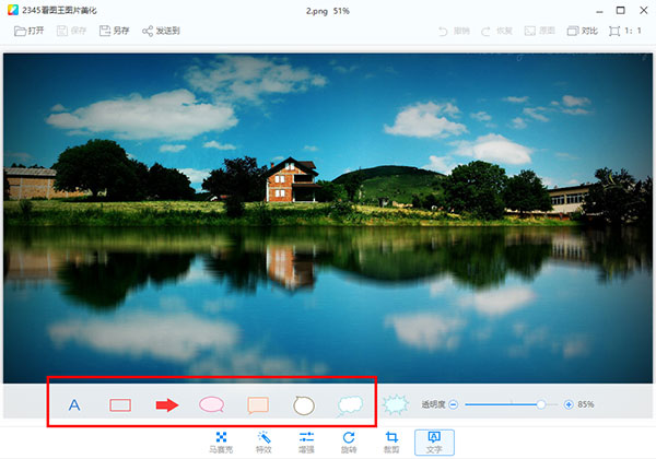 1)在圖片處理窗口,在工具欄點擊“文字”或者“氣泡”按鈕,氣泡和文字的位置可以自己設(shè)置的哦~氣泡還可以根據(jù)需要縮放、旋轉(zhuǎn)。