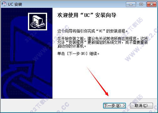 3、進入“歡迎使用“UC安裝向?qū)?rdquo;”直接跳過內(nèi)容瀏覽點擊下一步