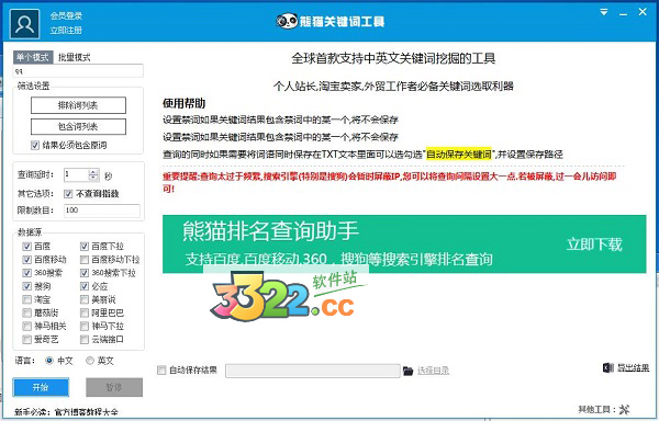 四、完成勾選點(diǎn)擊開始即可,現(xiàn)在熊貓關(guān)鍵詞工具箱就會(huì)幫助用戶自動(dòng)搜索相應(yīng)的關(guān)鍵詞啦