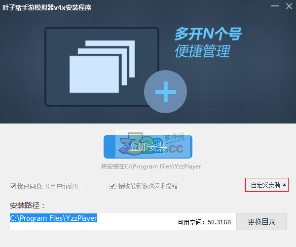 1.啟動軟件的安裝程序,如果需要更換安裝位置點擊“自定義安裝”就可以進行更改。