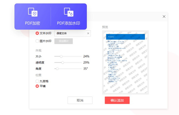 只需幾秒鐘,即可給你的PDF文件添加圖片或文字水印、設(shè)置加密,以確保敏感數(shù)據(jù)的機(jī)密性。