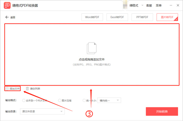 3、將需要轉(zhuǎn)換的一個(gè)或多個(gè)圖片文件拖入頁(yè)面中,或在框內(nèi)“單擊”來(lái)添加文件,