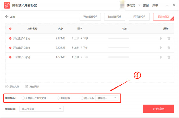 4、選擇需要的輸出格式——合并到一個(gè)PDF文件、圖片壓縮、統(tǒng)一大小,可多選;