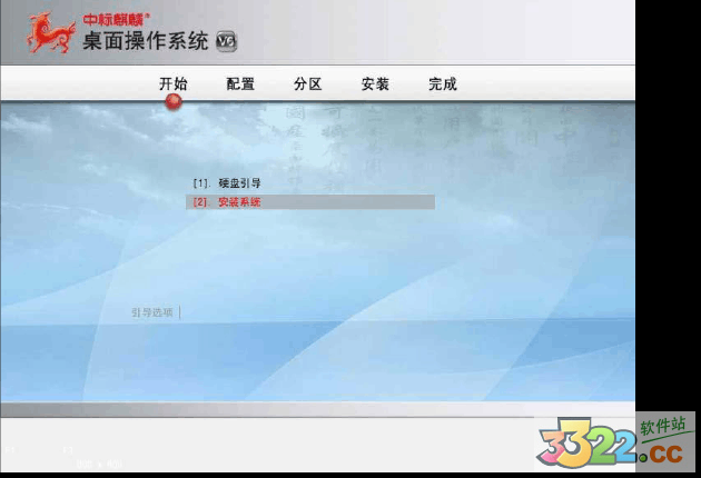 1、如果計(jì)算機(jī)的BIOS支持光驅(qū)引導(dǎo),那么插入中標(biāo)麒麟桌面操作系統(tǒng)安裝光盤(pán),設(shè)置BIOS后就可以直接從光驅(qū)安裝了。啟動(dòng)中標(biāo)麒麟桌面操作系統(tǒng)安裝程序后,首先出現(xiàn)在您面前的是中標(biāo)麒麟桌面操作系統(tǒng)安裝程序功能選擇界面,選擇硬盤(pán)引導(dǎo),進(jìn)入硬盤(pán)啟動(dòng)界面。回車(chē)確認(rèn)后系統(tǒng)進(jìn)入到硬盤(pán)引導(dǎo)中,系統(tǒng)將從已經(jīng)安裝的系統(tǒng)中啟動(dòng)。
