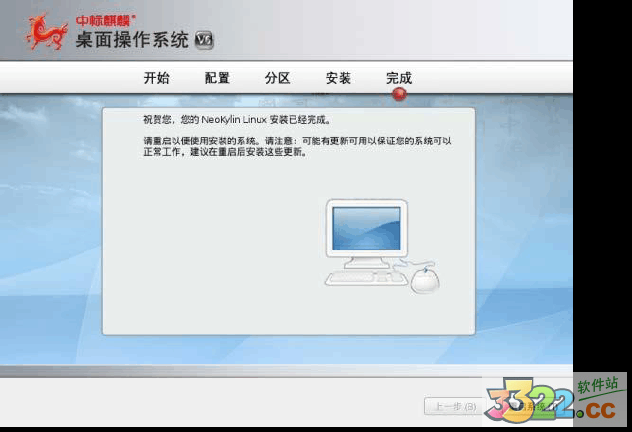 6、在中標(biāo)麒麟桌面操作系統(tǒng)安裝程序?qū)⑷繑?shù)據(jù)都寫(xiě)入硬盤(pán)后,系統(tǒng)進(jìn)入完成安裝界面。安裝完成界面在完成安裝后重啟系統(tǒng),中標(biāo)麒麟桌面操作系統(tǒng)6.0安裝完成!