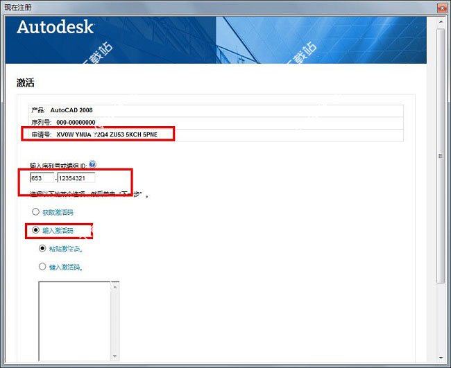 2、輸入序列號:653-12354321,并勾選“輸入激活碼”及“粘貼激活碼”,然后鼠標(biāo)右鍵復(fù)制界面中的“申請?zhí)?rdquo;,之后將該注冊窗口暫時放置一邊