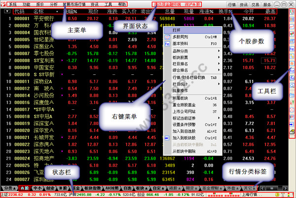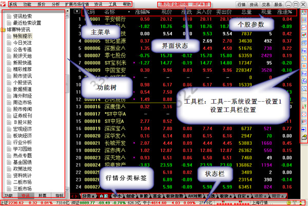 【狀態(tài)欄】顯示上證指數(shù)、深證指數(shù)、中小板指數(shù)、多空紅綠軍和連接的行情主站。
