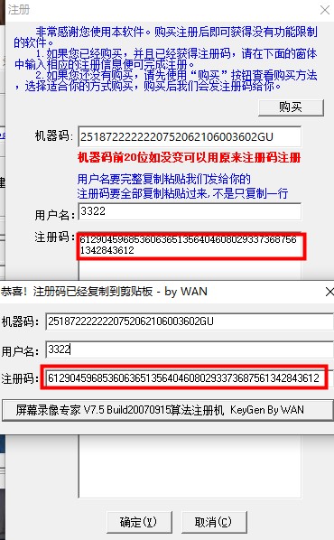6、打開“屏幕錄像專家注冊機(jī).exe”,將將屏幕錄像專家的機(jī)器碼復(fù)制到注冊機(jī)中,填寫用戶名之后,點(diǎn)擊生成注冊碼,再將注冊碼復(fù)制到軟件注冊框中,點(diǎn)擊確定;