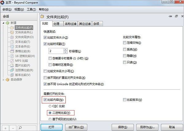 2、在打開的文件夾比較設(shè)置對話框,在比較下勾選“比較內(nèi)容”,在此目錄下選擇“二進(jìn)制比較”,如下圖所示;