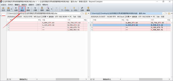 2、對比結(jié)果中存在差異點(diǎn)的所在行都被顯眼的紅色標(biāo)出,能非常清楚明了的對比出兩者的差異,在左下角還可以找到差異行的數(shù)量,以了解兩個表格的整體差異