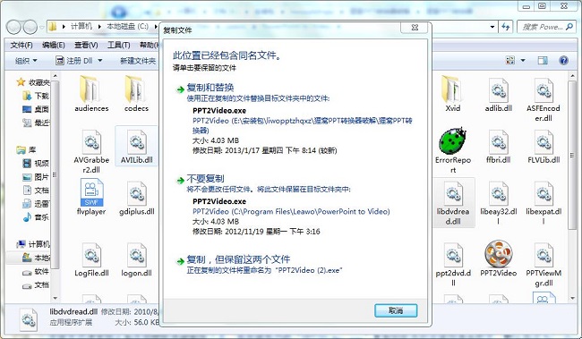 安裝完成貍窩照片制作視頻軟件破解版之后,將安裝包內(nèi)的“PPT2Video.exe”復(fù)制到軟件的安裝目錄中即可,默認(rèn)路徑為C:\Program Files\Leawo\PowerPoint to Video,然后覆蓋即可完成破解
