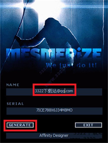 2、打開注冊(cè)機(jī),輸入:“3322下載站@qq.com”,點(diǎn)擊“GENERATE”得到產(chǎn)品密鑰