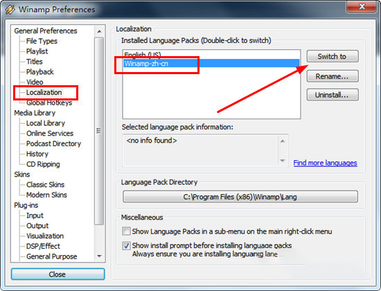4、在左邊的欄目中點擊“Localization”欄,選擇紅框標注內(nèi)的“ZH-CN”選項,點擊其中的Switch to選項即可切換為中文,如下圖所示: