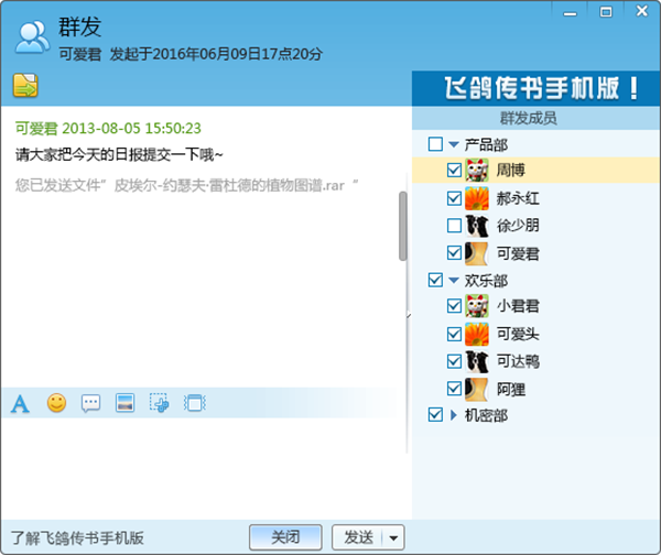 1、討論組模塊也在飛鴿傳書中做了很多改進,已經(jīng)完全支持討論組的消息和文件收發(fā),并且可以隨時查看消息和文件的收發(fā)記錄。