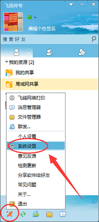 3、接著在飛鴿傳書界面左下角的“菜單”中打開“系統(tǒng)設(shè)置”;