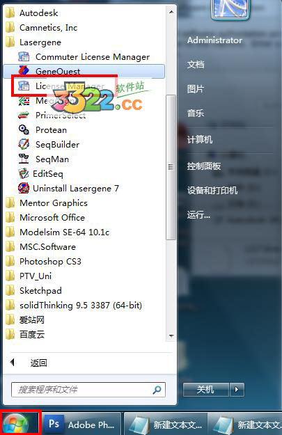 一、“開(kāi)始”菜單(菜單在桌面左下角,圖案為Windows官方標(biāo)志)-所有程序-“Lasergene”文件夾- 雙擊打開(kāi)“License Manager”