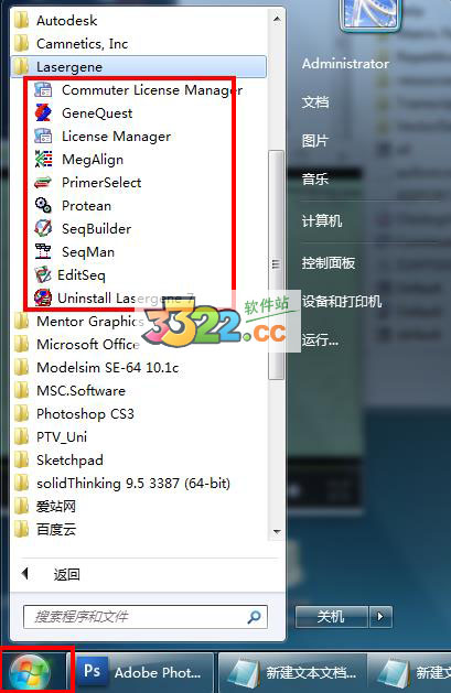 “開(kāi)始”菜單(菜單在桌面左下角,圖案為Windows官方標(biāo)志)-所有程序-“Lasergene”文件夾-然后用戶(hù)自主選擇需要使用的功能程序