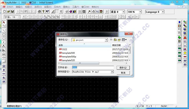 4、這樣,我們的新工程就創(chuàng)建好了.選擇菜單[文件]/[保存]可保存工程.如下圖所示,我們保存工程為3322.epj,按下[保存]即可