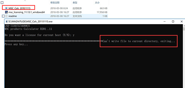 2、然后首先先在MAGNiTUDE文件夾中找到MSC_Calc_20180531.exe主程序,然后右鍵以管理員身份運(yùn)行,輸入Y,從而生成一個(gè)許可證文件license.dat,提示*Can"t write file to current directory, exiting.. ,說明權(quán)限不夠