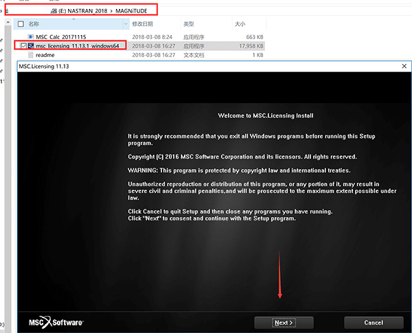 4、接著我們安裝激活服務(wù)器,點(diǎn)補(bǔ)丁文件夾內(nèi)的MSC_licensing_11.3.1_windows 64.exe,點(diǎn)next繼續(xù)