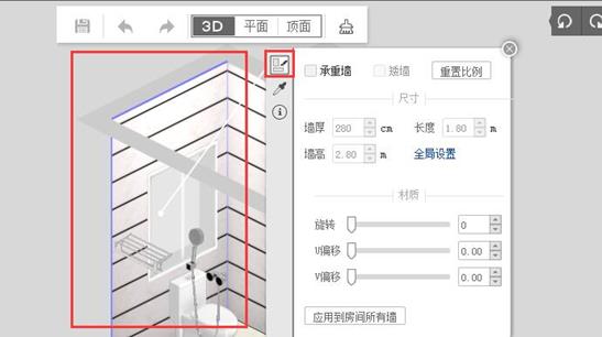 4、通過右上角旋轉(zhuǎn)功能依次選擇衛(wèi)生間不同墻面進(jìn)行該分區(qū)操作