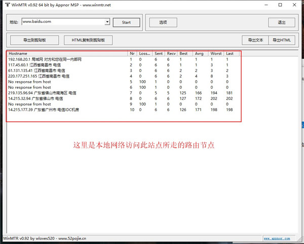 3、如下圖可以,可以看到本地網(wǎng)絡(luò)訪問此站點所走的路由節(jié)點;