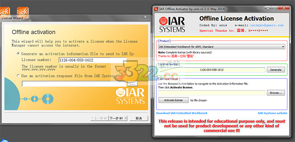 4、在注冊(cè)機(jī)中選擇好軟件,我們的軟件全稱(chēng)是IAR Embedded Workbench for ARM。然后將激活碼生成,復(fù)制到注冊(cè)窗口。