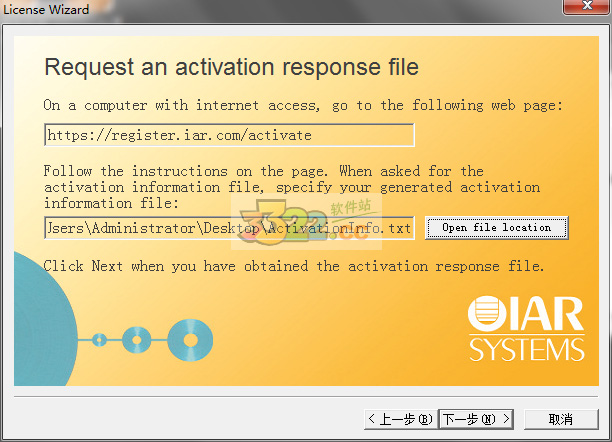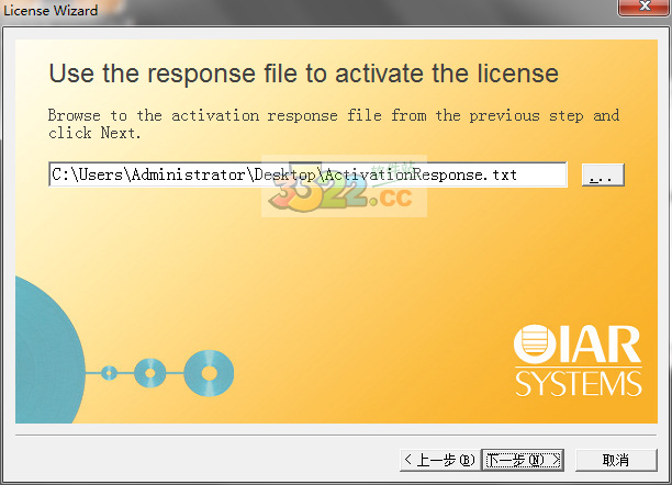 9、回到注冊(cè)窗口,選擇剛注冊(cè)機(jī)生成的文檔,然后點(diǎn)擊下一步,就成功的破解了IAR FOR ARM 了。